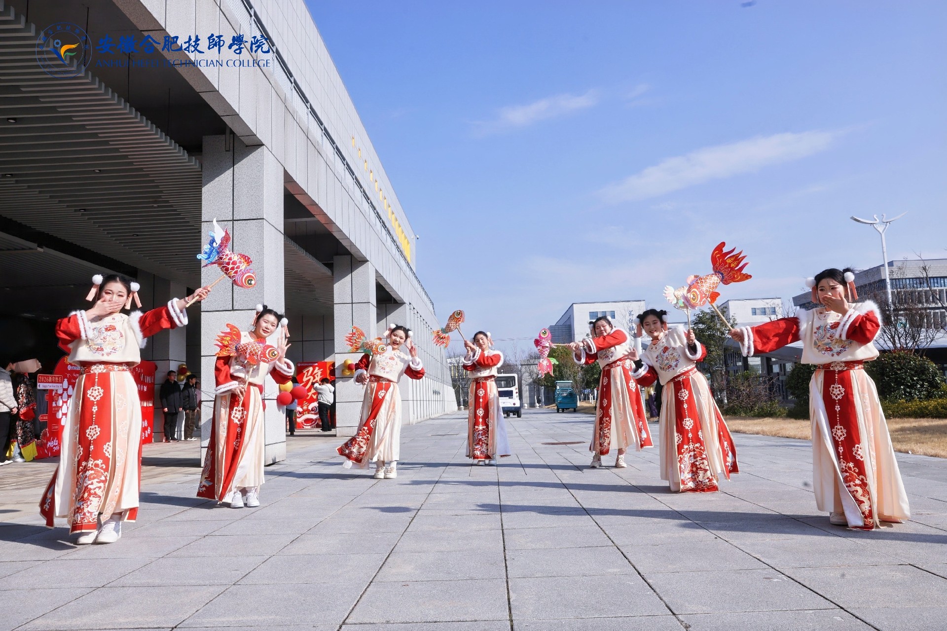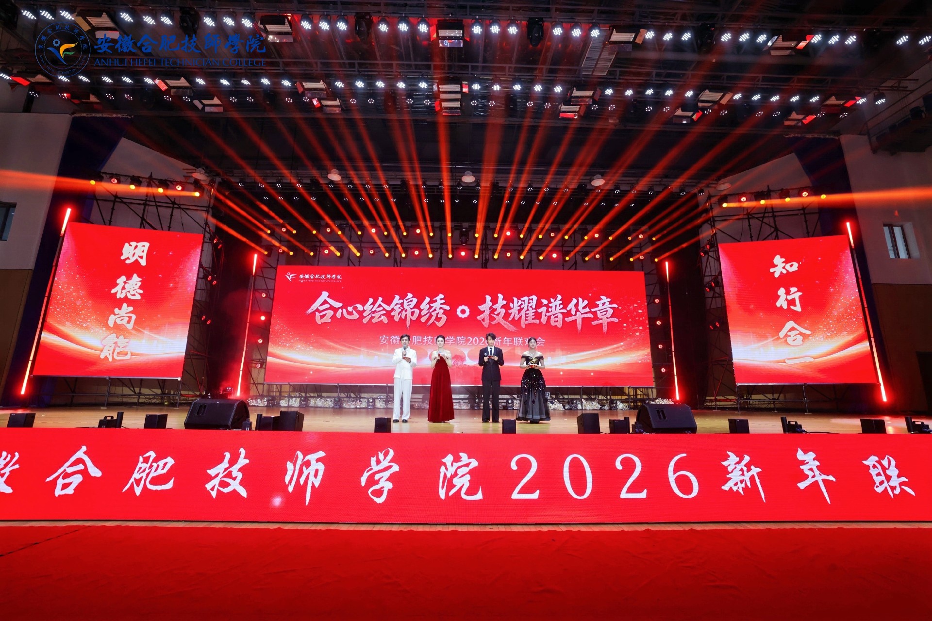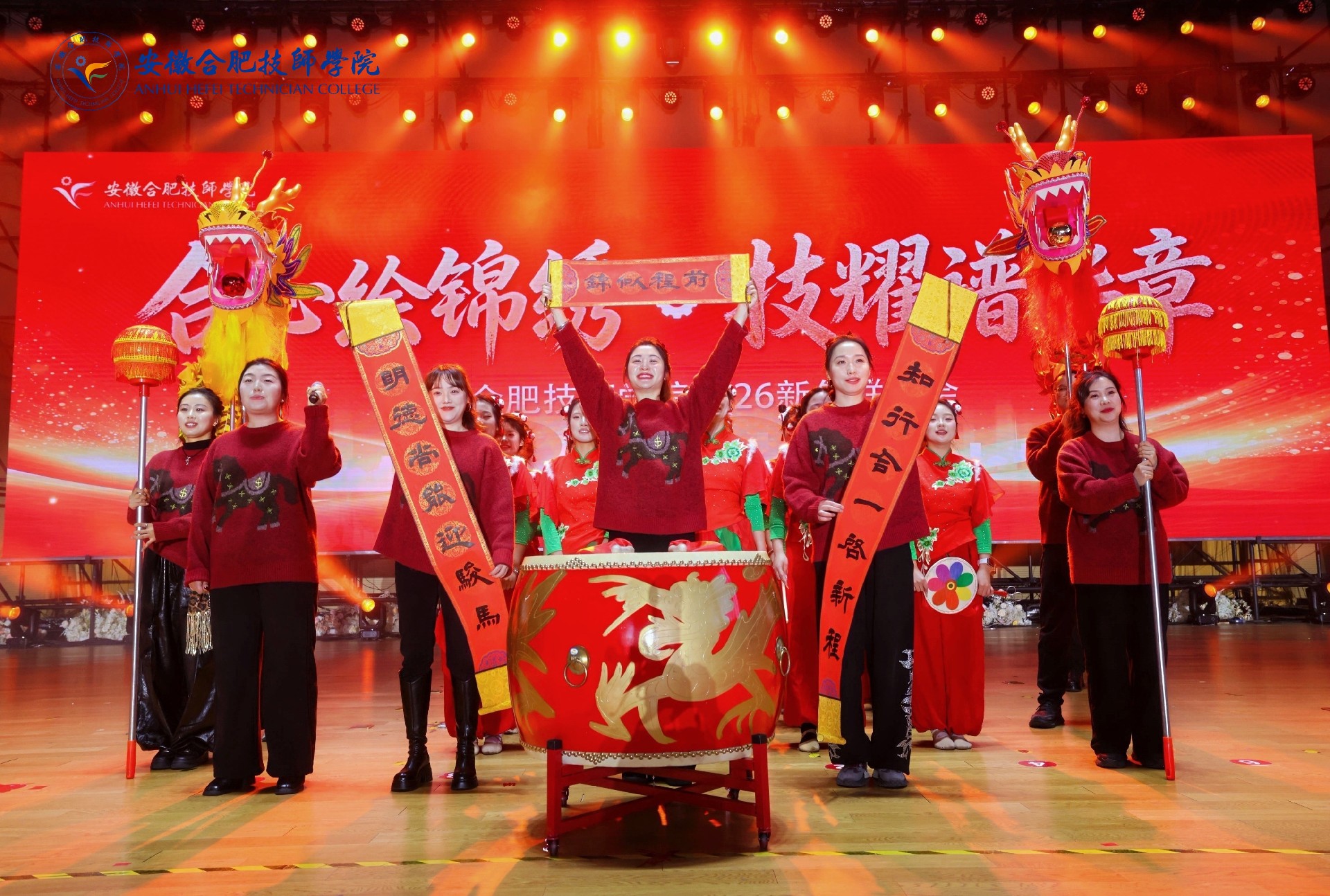 1月9日下午,合肥技师学院”合心绘锦绣·技耀谱华章“2026年新年联欢会在学院篮球馆隆重举行。合肥市人社局相关领导、学院领导班子全体成员、警校共建单位代表、合作企业嘉宾以及全院师生欢聚一堂,共迎新春、同庆佳节。